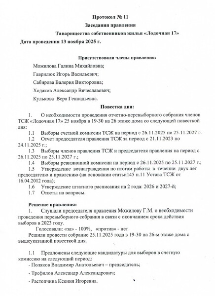 Протокол заседания Правления № 11 от 13.11.2025 г.