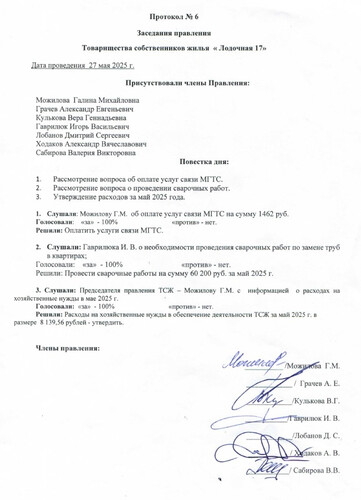 Протокол заседания Правления № 6 от 27.05.2025 г.